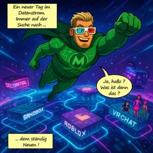 Metaverse Man gleitet mal wieder durch die leuchtenden Plattformen des Metaversums. Decentraland, The Sandbox Roblox. Alle ziehen an ihm vorbei.