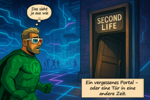 Doch plötzlich bleibt sein Blick an etwas Seltsamem hängen: Eine altmodische hölzerne Tür, schief im Rahmen hängend. Sie trägt das Schild „Second Life“. Das Logo wirkt retro, fast ein wenig aus der Zeit gefallen.