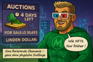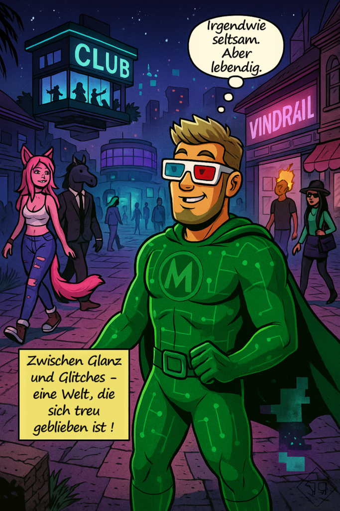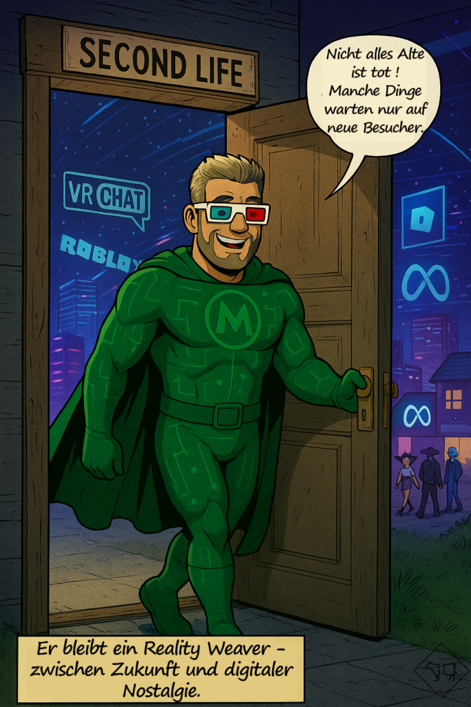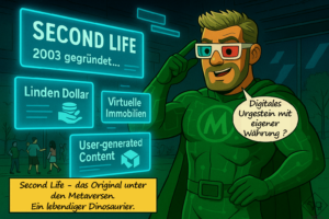 Neugierig aktiviert er seine Brille, recherchiert im Overlay und stößt auf Fakten: „Second Life ist ein seit 2003 existierendes, sozial orientiertes 3D-Online-Universum, entwickelt von Linden Lab, in dem Nutzer als ‚Residents‘ Avatare erstellen, bauen, handeln und interagieren können. „[1]