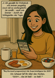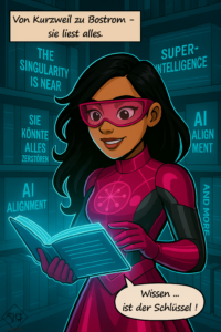 Im stillen Metaverse-Bibliotheksraum aktivierte sie ihren Hyper-Lernen-Modus. Um sie herum flimmerten Begriffe wie Singularität, Artificial General Intelligence und kognitive Explosion.